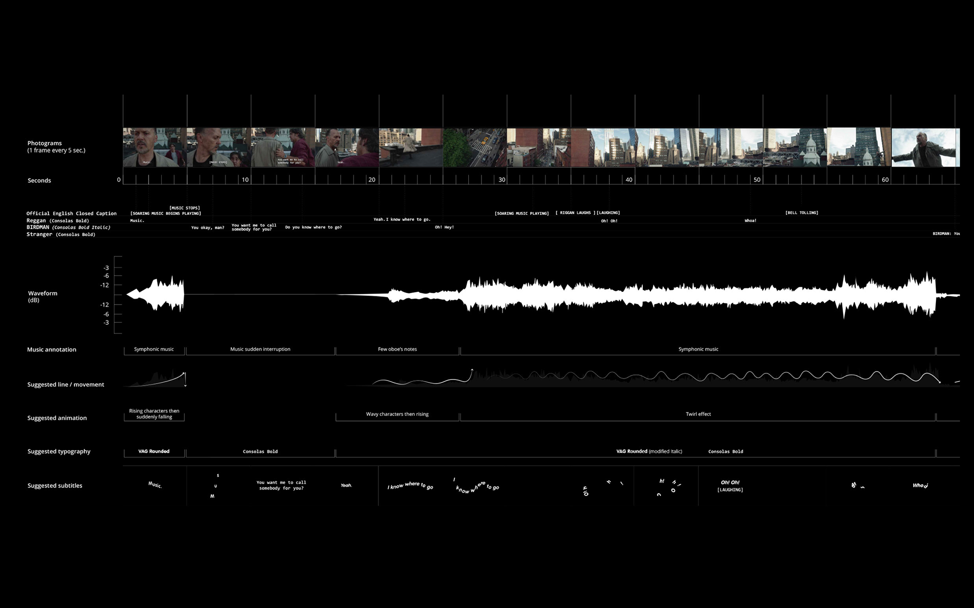 After my research, I've developed a project that could match my conclusion. The concept consists in generating an alternative translations to the Closed Caption for two different scenes from the movie Birdman. I've chosen two different scenes were the emotion is dictated by the music. The translation were thus based on the emotion given by the music. The extracts were divided in a board in order to create a methodology of translation into kinetic typography.