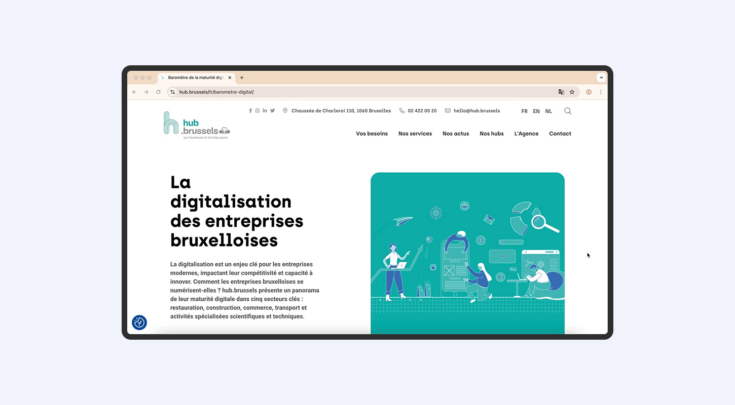 In collaboration with Cafeine.studio and hub.brussels, I designed the report “The Digitalisation of Brussels Companies”, a visual overview of the digital maturity of businesses across key sectors in the region.